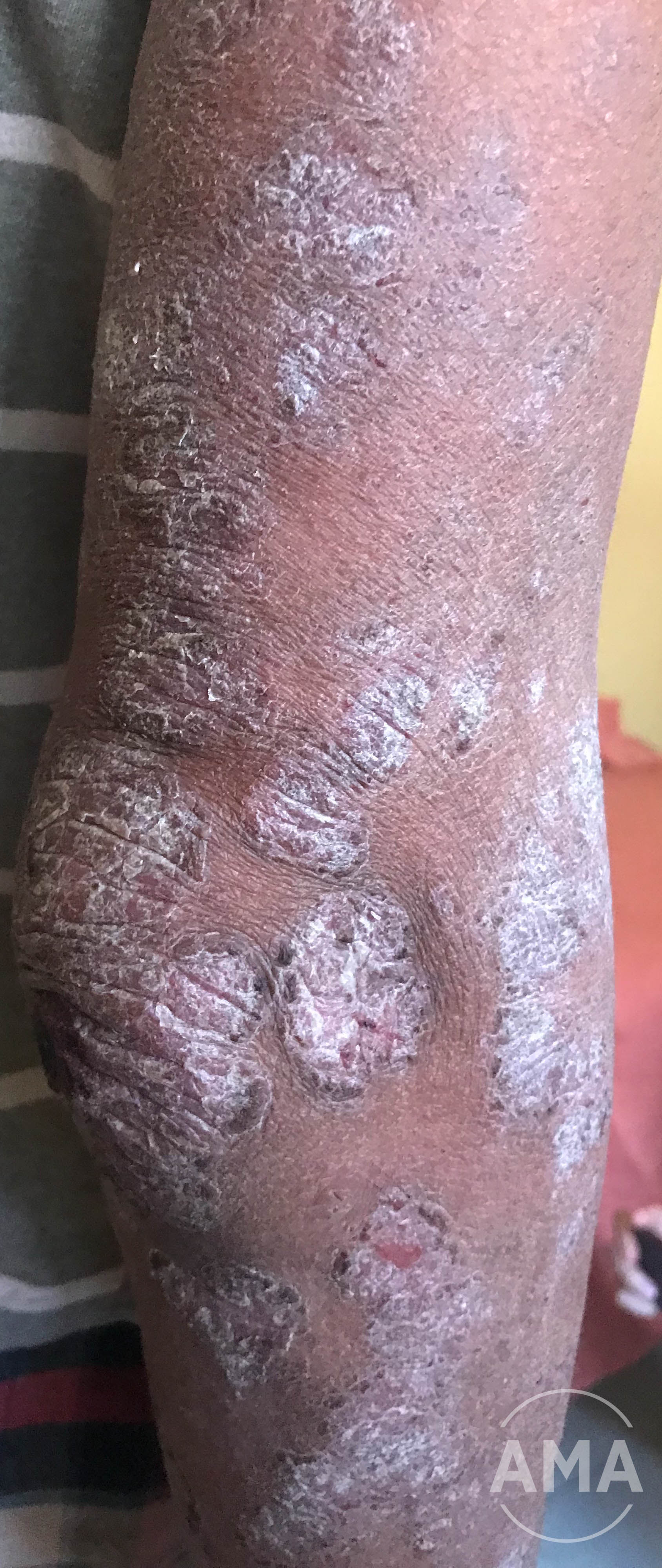 Psoriasis på overarm, her er forandringerne mere grålige og skarpt afgrænsede mod den normale hud. Kilde til foto