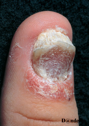 Foto af svær neglepsoriasis med fortykkelse og misdannelse af neglen og psoriasis i den omgivende hud. Venligst udlånt af Danderm