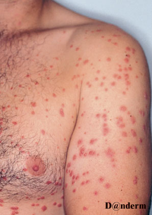 I stedet for de typiske plaque (håndfladestore pletter), kan sygdommen også give små, dråbeformede læsioner, som ofte rammer hele kroppen.