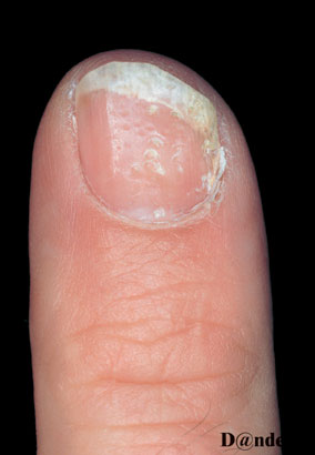Foto af psoriasisnegle med fingerbølprik og let afløsning af neglen. Venligst udlånt af Danderm