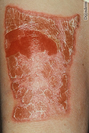 Foto af psoriasis på huden lige i det område, hvor der har siddet et stort plaster. Foto venligst udlånt af Danderm
