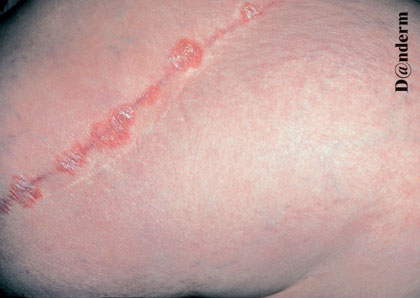 Foto af flænge i huden, hvor der efterfølgende kommer psoriasis udbrud, med lyserøde, skællende hudforandringer. Foto venligst udlånt af Danderm