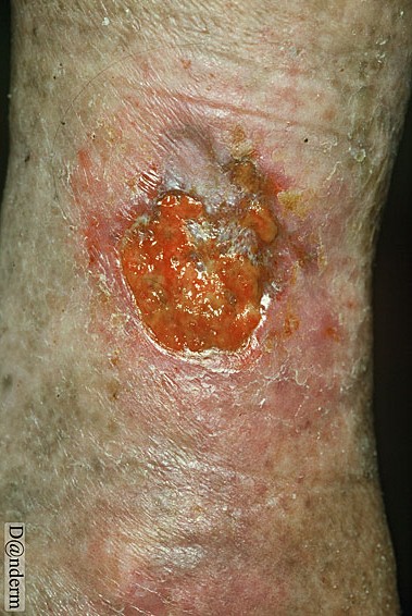 Sår, rød-brun til grålig misfarvning af huden og eksem i i området omkring anklen. Sårene kan være håndfladestore med en rød eller gul sårbund.