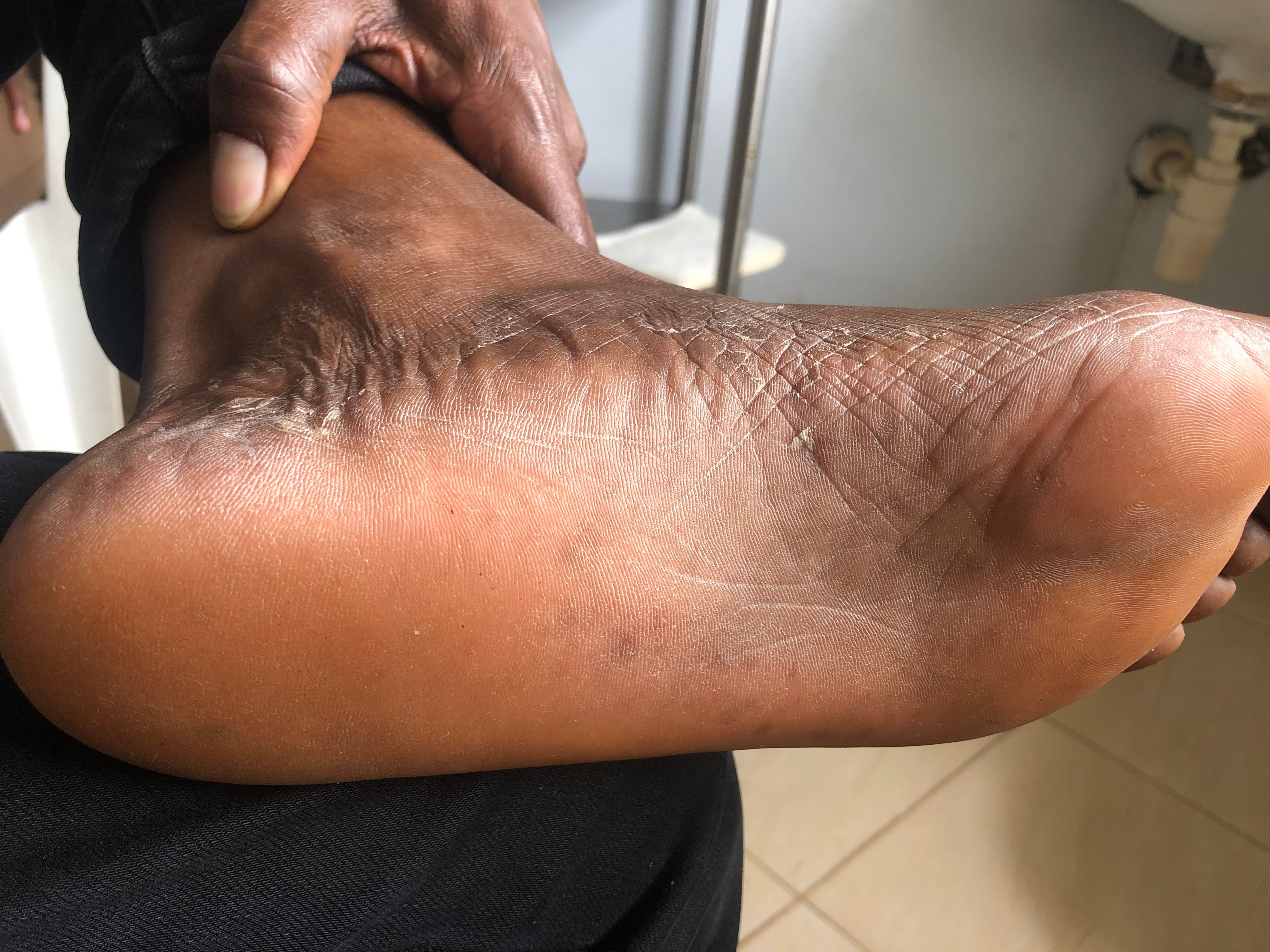 Sprækkedannelser i huden og afskalning, særligt mellem tæerne og i fodsålerne