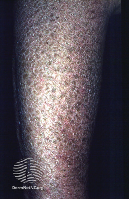 Skællene sidder især på strækkesiderne af arme og ben. Fodsåler og håndflader er tørre. Her sprækker huden let, hvilket kan give smertefulde revner, som kan være indgangsport for betændelse. Ansigtet går oftest fri.