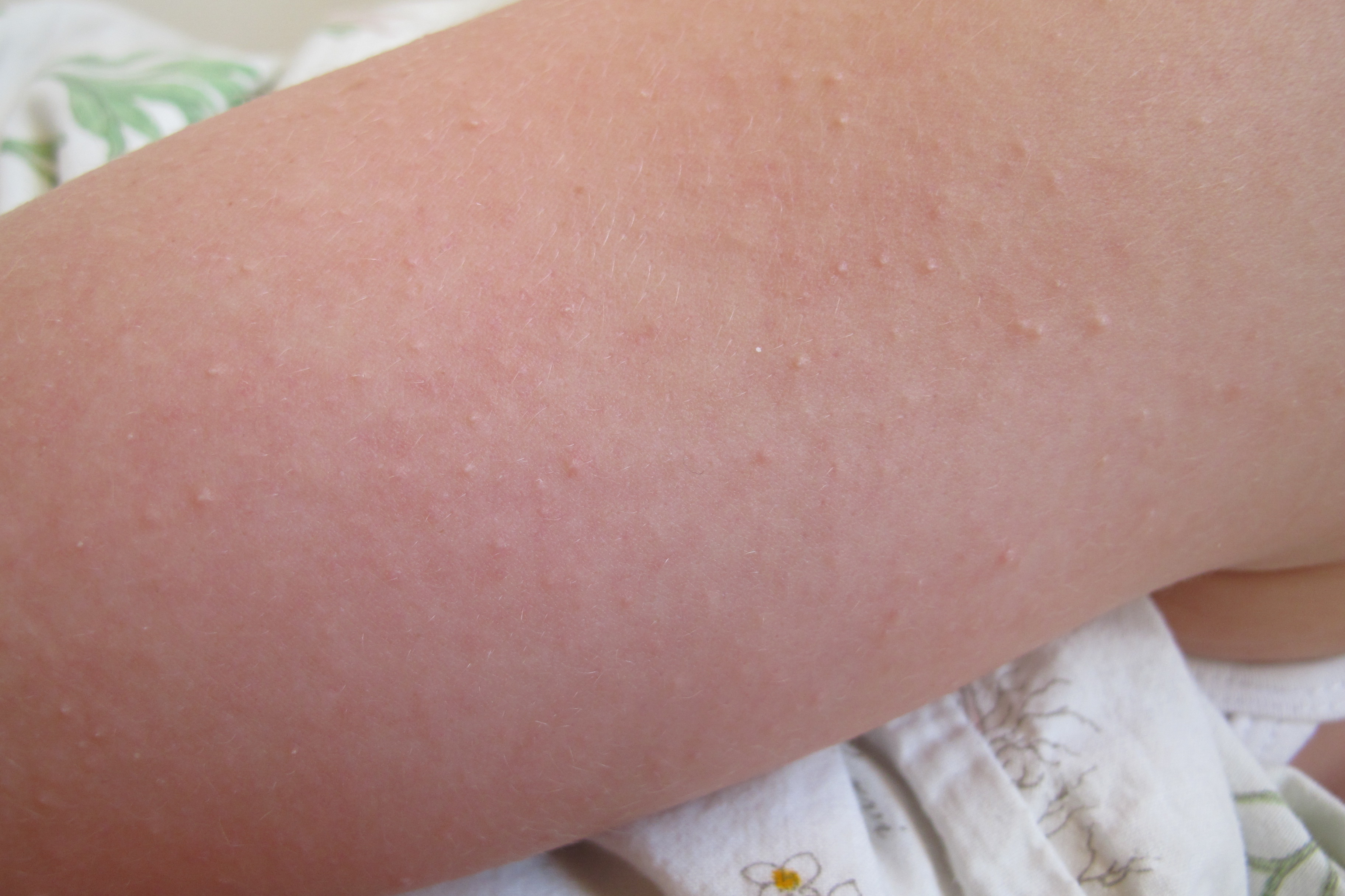Tilstanden ses som små faste knopper, især på overarmenes strækkesider, men kan også ses på lår og i ansigt.