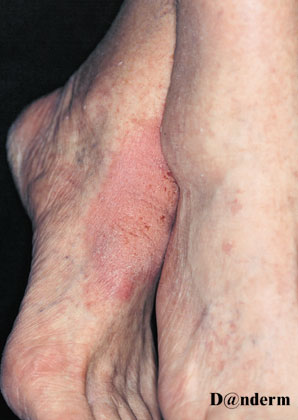 Et eksempel på neurodermatit på anklerneFoto venligst udlånt af DermNet