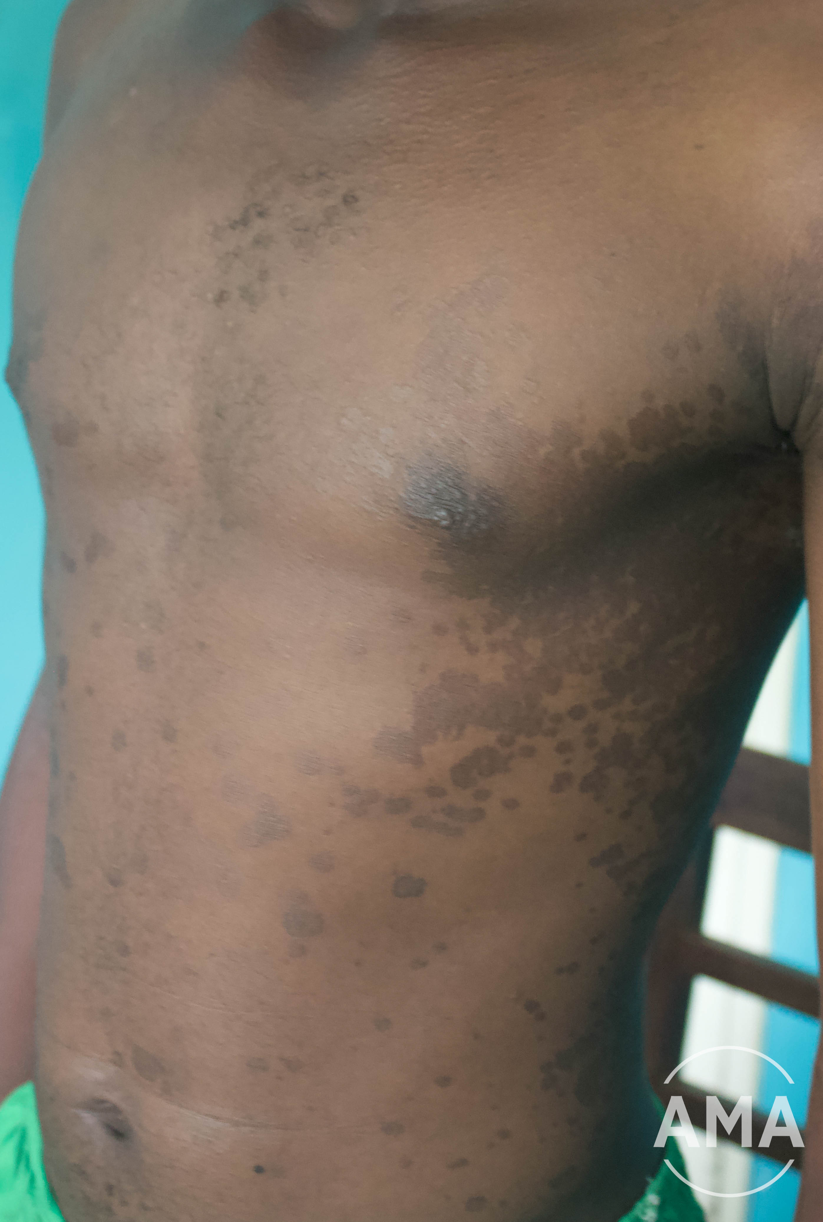 Tilstanden ses som skællende pletter, der er lyserøde eller brune på bleg hud, men bliver afbleget efter at huden udsættes for sol. Pletterne sidder typisk på bryst eller ryg. Ofte er pletterne lettere at se om sommeren som blege pletter på solbrun hud.