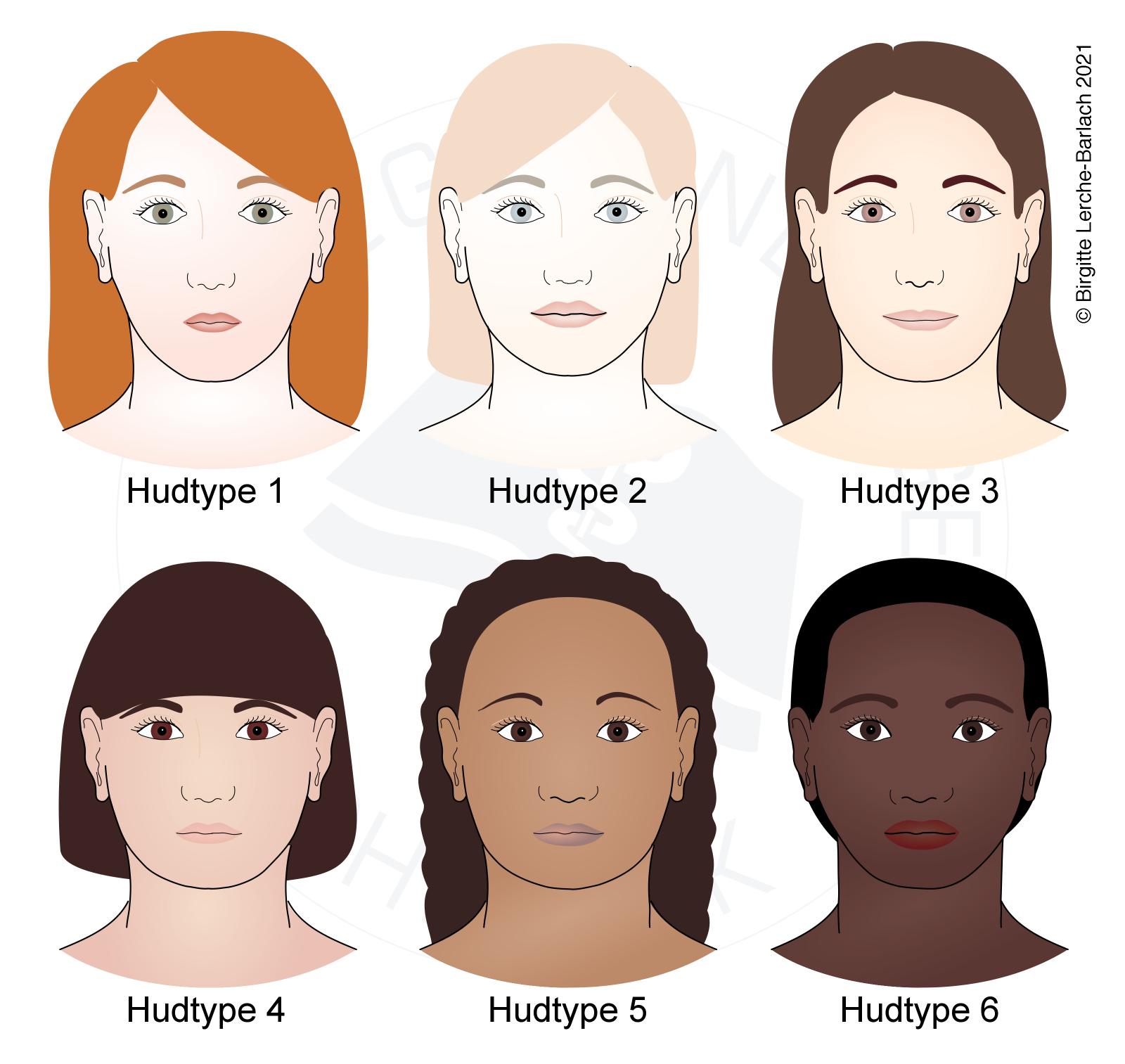 Huden bliver dog kun mørkere, dvs. brunere, hvis din hud er i stand til at danne pigment. Helt lyse rødhårede hudtyper (hudtype 1) kan fx stort set ikke ikke danne pigment og har derfor ingen beskyttelse mod solens stråler. Helt mørke hudtyper, med næsten helt sort hud (hudtype 6), er rigtigt godt beskyttet mod både UVA og UVB-stråler, da huden er maksimalt pigmenteret. Se illustration af de seks hudtyper herunder.