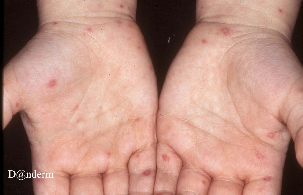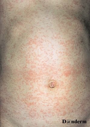 Udslættet starter på ører og hals og breder sig ud over hele kroppen i løbet af 2-3 dage. Udslættet består af flade, lyserøde elementer, der senere bliver mørkere, og som flyder sammen til et sammenhængende udslæt