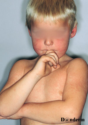 Udslæt uden særlig feber eller påvirket almentilstand. Udslættet optræder først med rødme på kinderne, og kan sprede sig til krop, arme og ben. Området omkring munden, næsen og panden går fri. Udslættet er svagt rødt, flyder sammen til større områder og danner efterhånden guirlander på huden