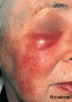 Begynder oftest med lyserøde områder på benene. Efterhånden overgår områderne til at være egentlige hudblødninger (såkaldt vaskulitis)