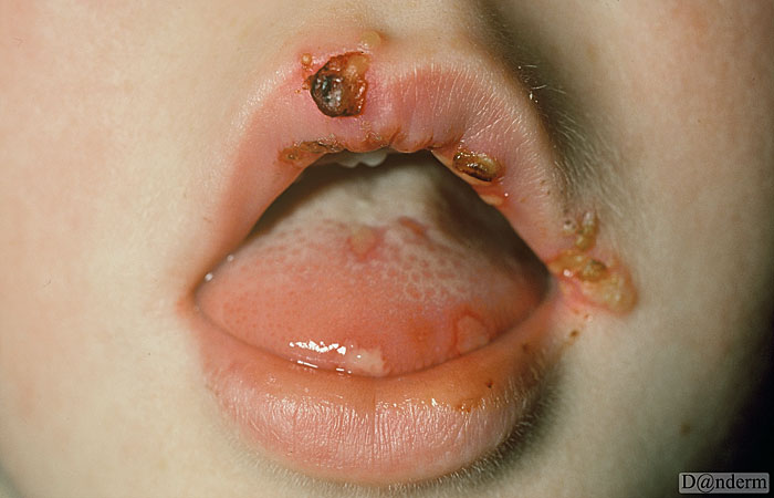 Starter som et knoppet udslæt, som udvikler sig til væskeholdige små blærer i ansigt og på kroppen først, derefter på arme og ben. Samtidigt ses små blærer og sår