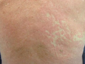- Et rødligt udslæt på ansigt, hals og bryst kan tilkomme et par dage efter de øvrige symptomer. Udslættet ligner solskoldet hud og kan blive ganske udtalt med efterfølgende kløe og afskalning
