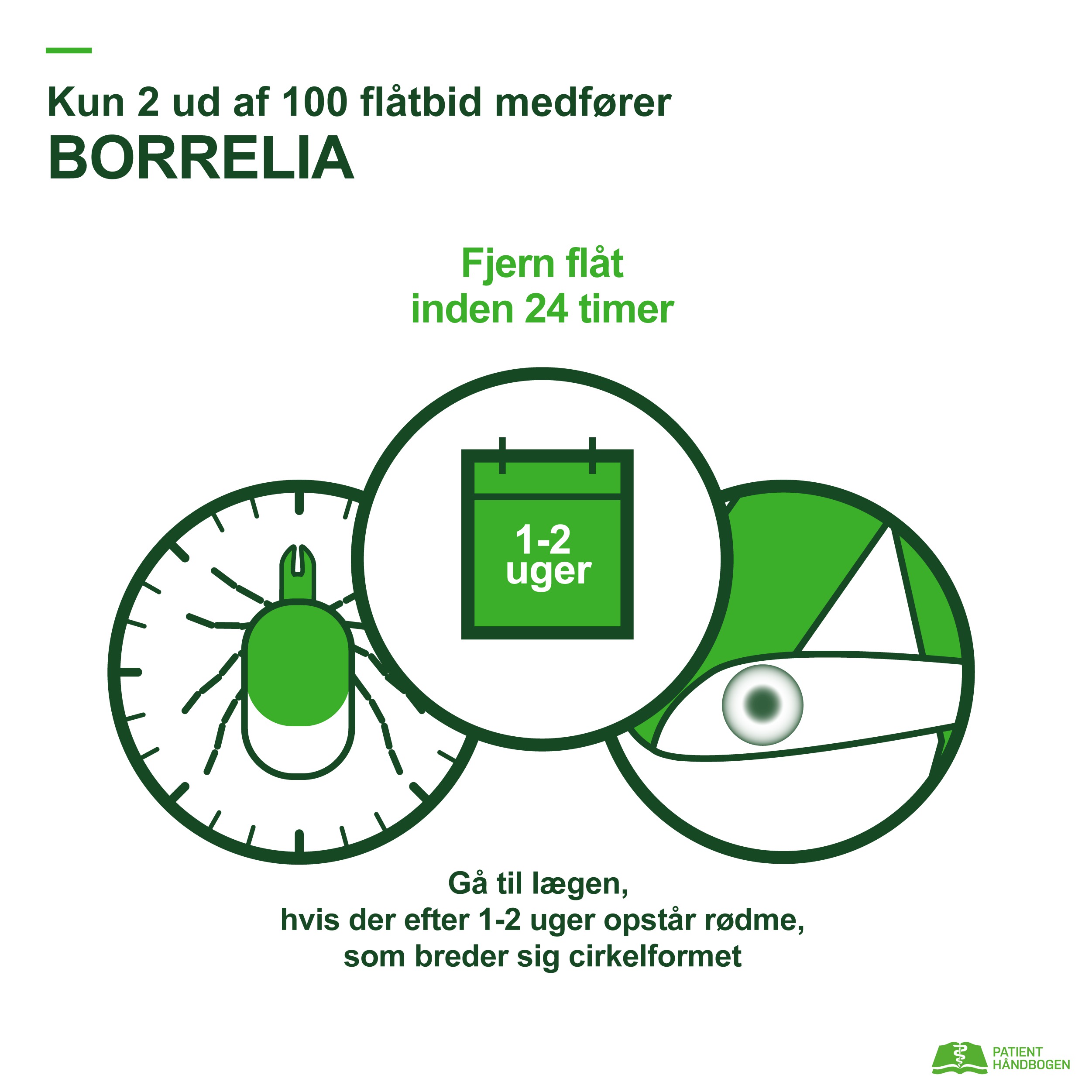 Hvis du bliver bidt, det vil sige, at skovflåten sidder fast, er det alligevel sjældent, at det medfører sygdom. For det første er det kun en lille del af skovflåterne, som indeholder bakterier, og skovflåten skal sidde mindst 16 timer på huden, før man bliver smittet med borrelia. Det er beregnet, at ca. 2 ud af 100 flåtbid fører til sygdom. Det anbefales derfor ikke at tage forebyggende antibiotisk behandling, hvis man er blevet bidt af en flåt.
