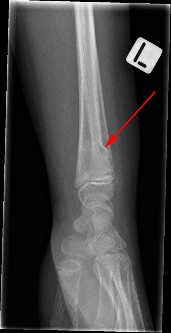 Røntgenundersøgelse af venstre hånd viser en såkaldt green-stick brud (rød pil) hos en yngre person.