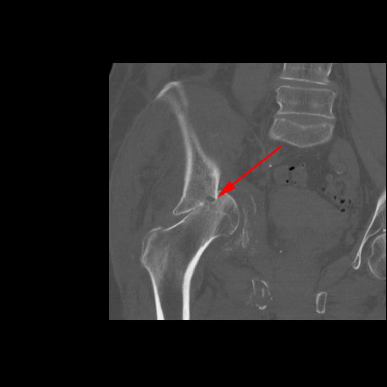 CT-skanning af højre hofte (patienten fra CT scanning ovenfor), der viser knusningen af både caput femoris og acetabulum (rød pil).