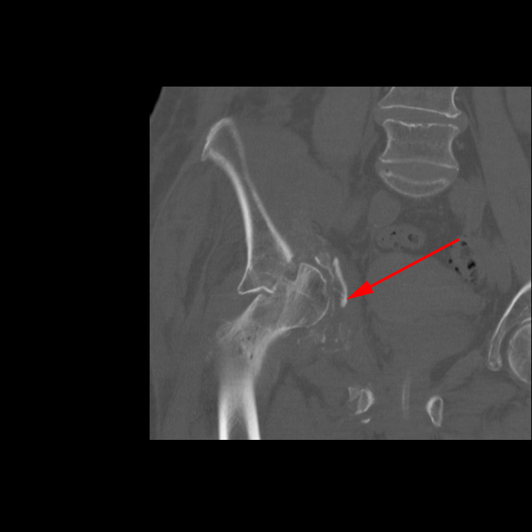 CT-skanning af højre hofte, der viser knusning af acetabulum (rød pil).