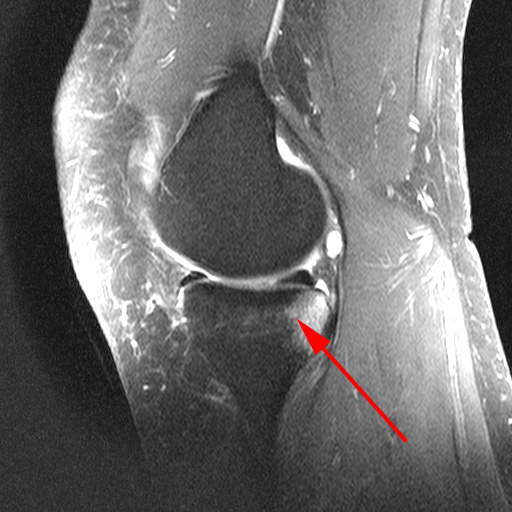 MR-skanning af knæet der viser småfrakturer i trabeklerne (bone bruise) hos to forskellige patienter. Denne slags småfrakturer er ikke synlige på en almindelig røntgenoptagelse.