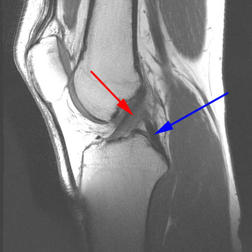 MR-skanning af knæet der viser normale korsbånd (forreste (rød pil) og bagerste (blå pil)).