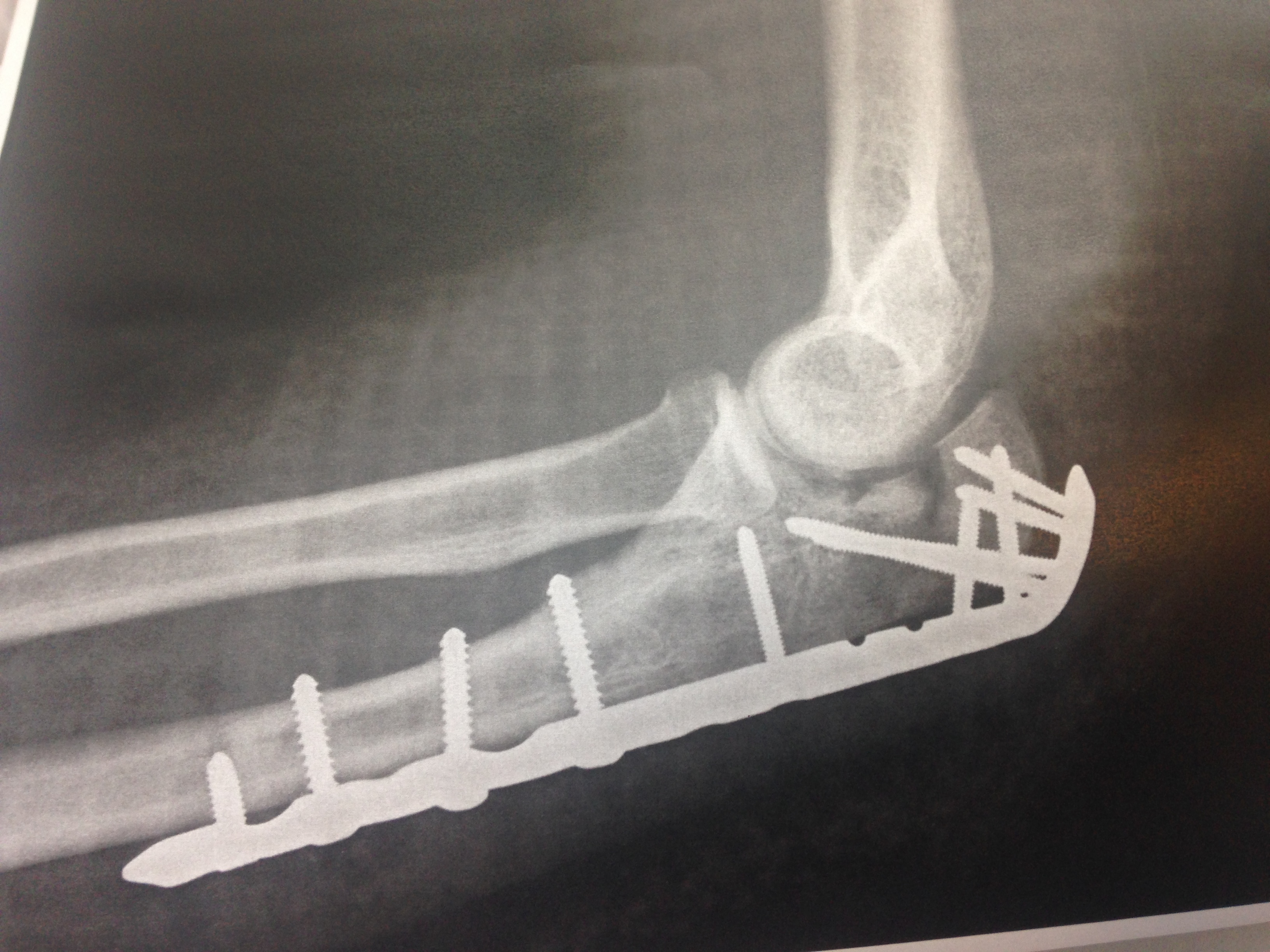 - Røntgenbilledet viser, hvordan man har sat skruer og metalplade i albueknoglen for at holde et forskudt brud på olecranon sammen.