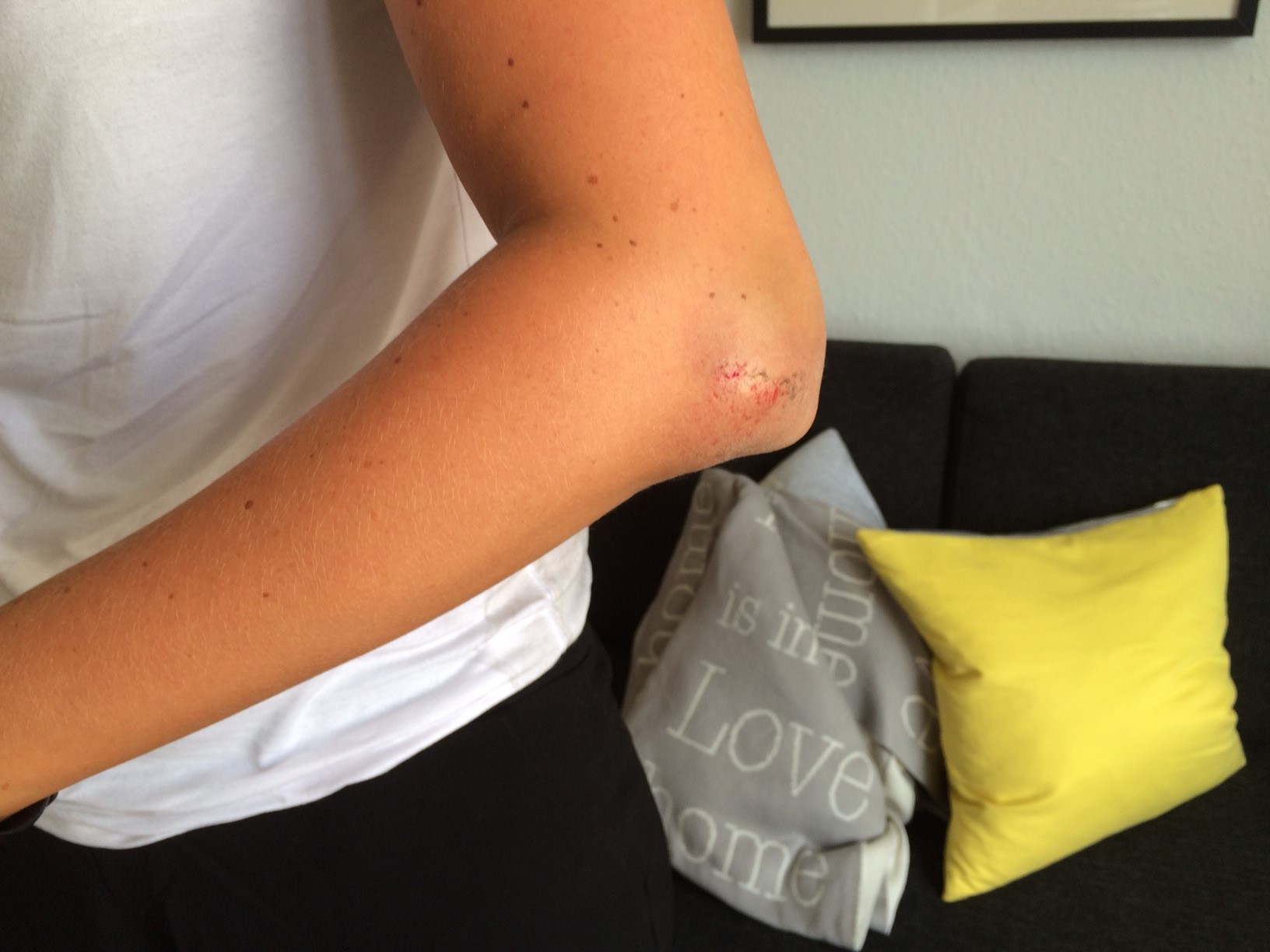 - Første billede viser arret to uger efter en operation, hvor man har sat en metalplade ind i albueknoglen efter et forskudt brud på olecranon.