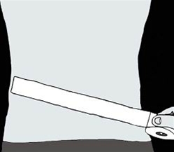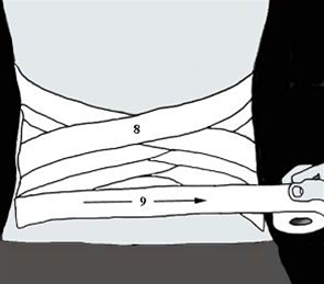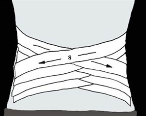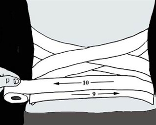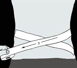 - Træk første tur fra venstre sides hoftebenskam og mod højre