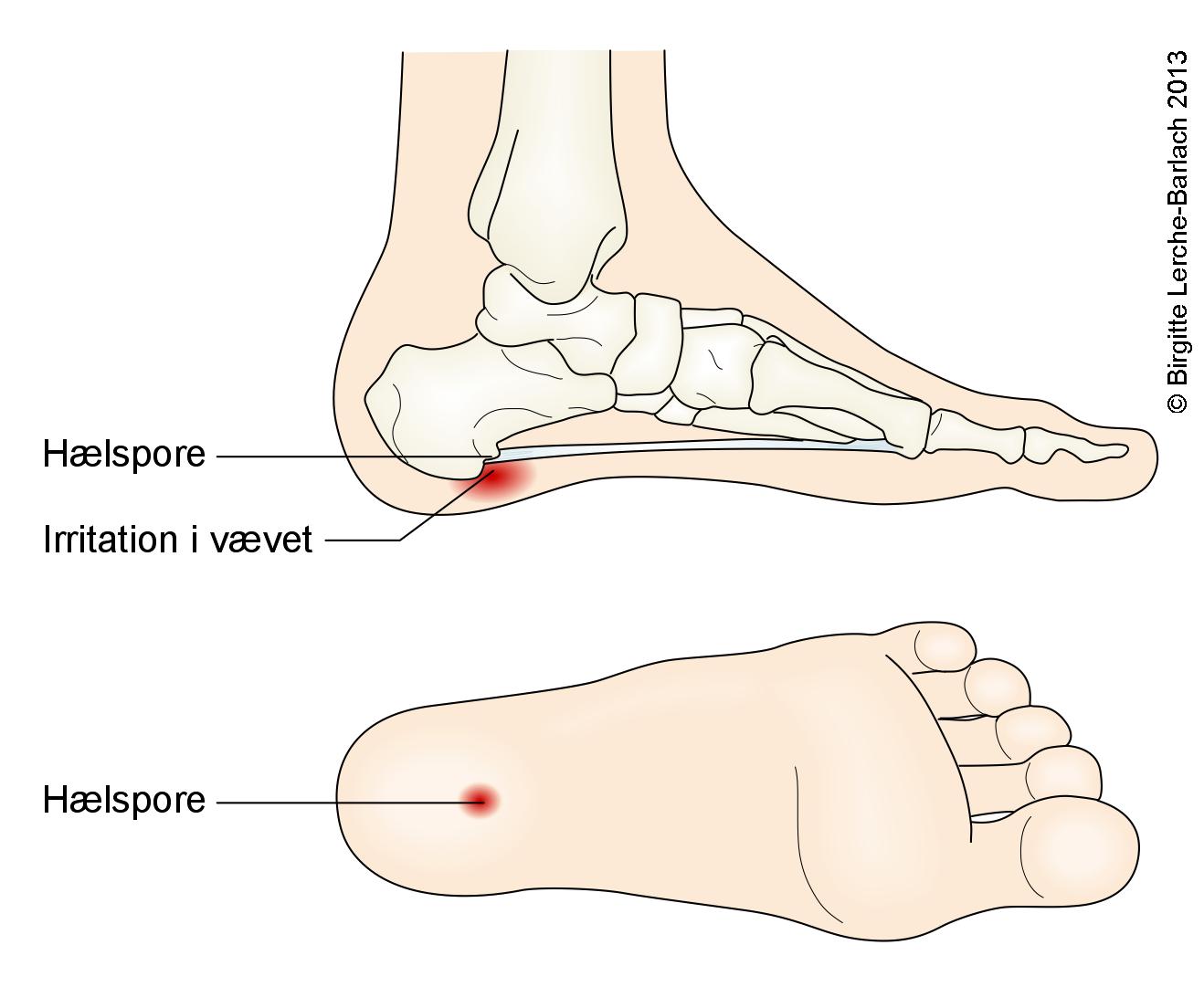 Bindevævspladen i fodsålen hæfter til hælens knogle, og her kan den blive overbelastet eller udsat for slid