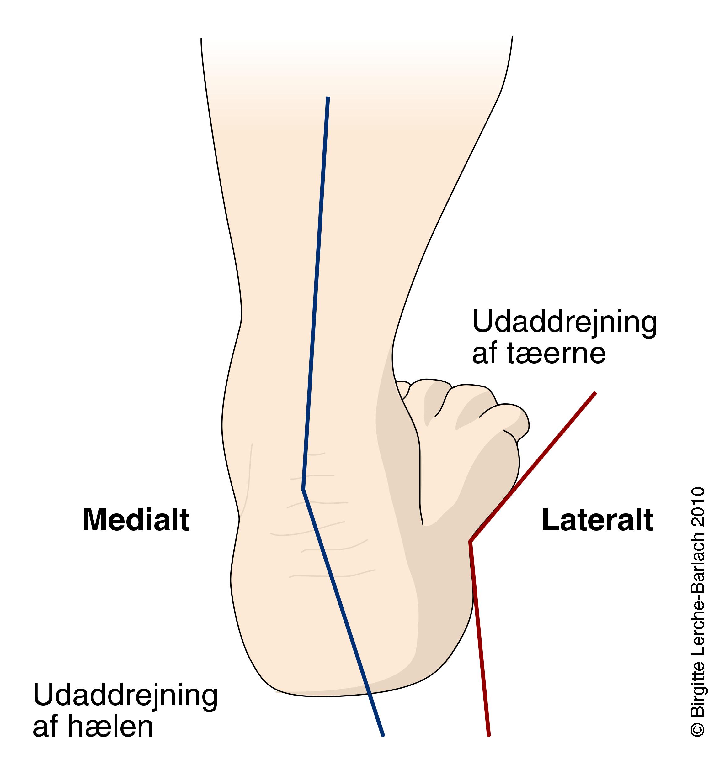 Fejlstillingen af foden er karakteristisk, ligesom det skæve slid på skoene.