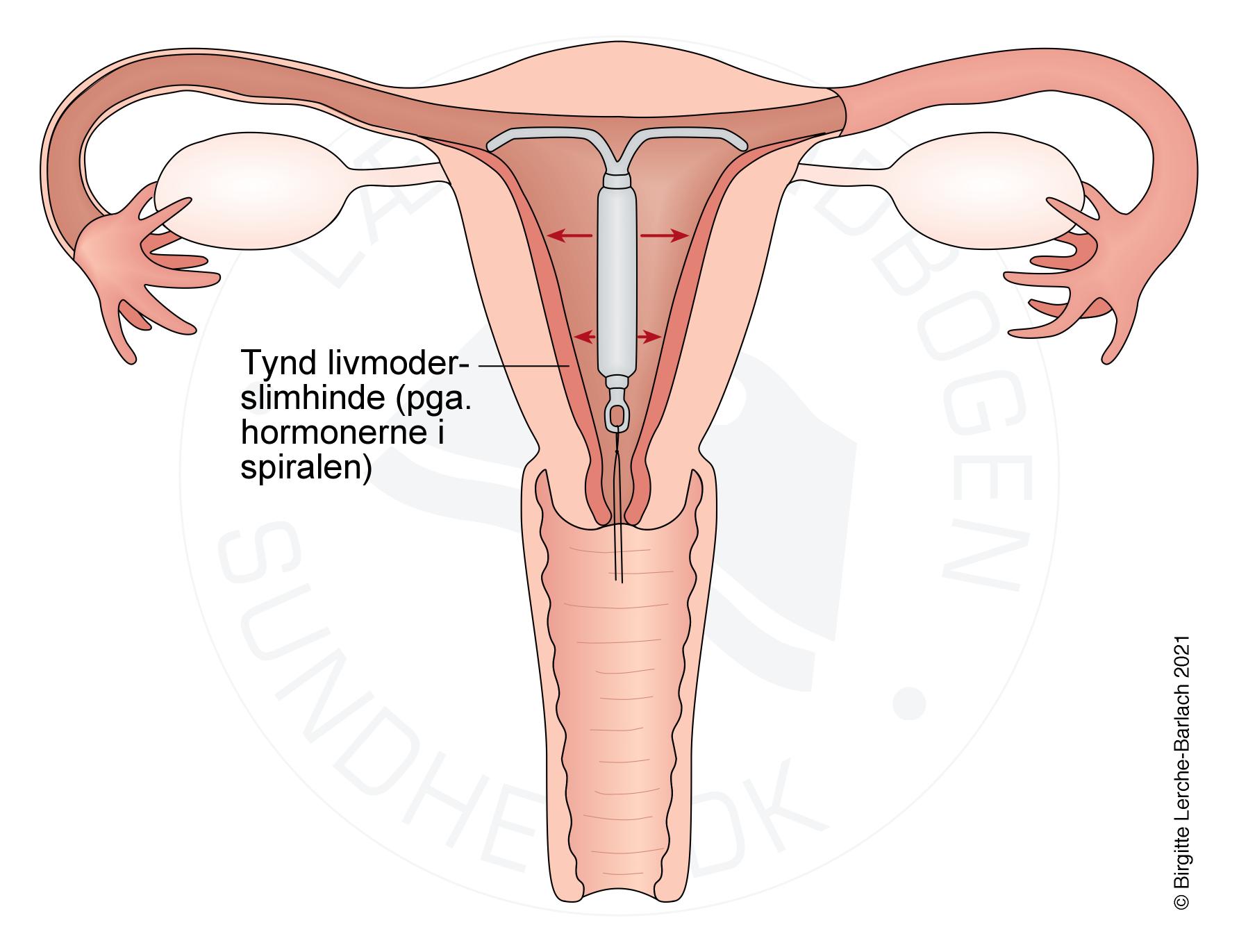 Øverste billede viser, hvordan slimhinden i livmoderen ændres og vokser i løbet af en naturlig menstruationscyklus, der ikke påvirkes af f.eks. en hormonspiral. Slimhinden udstødes ved menstruationen. Det nederste billede viser en livmoder med hormonspiral. Her forbliver slimhinden relativ tynd, og menstruationen udebliver eller bliver beskeden.
