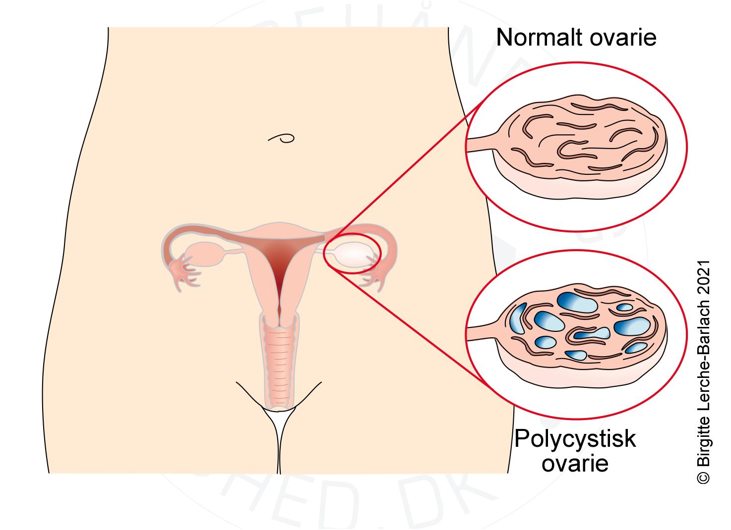 Normal ovarie og ovarie med policystisk ovariesyndrom.