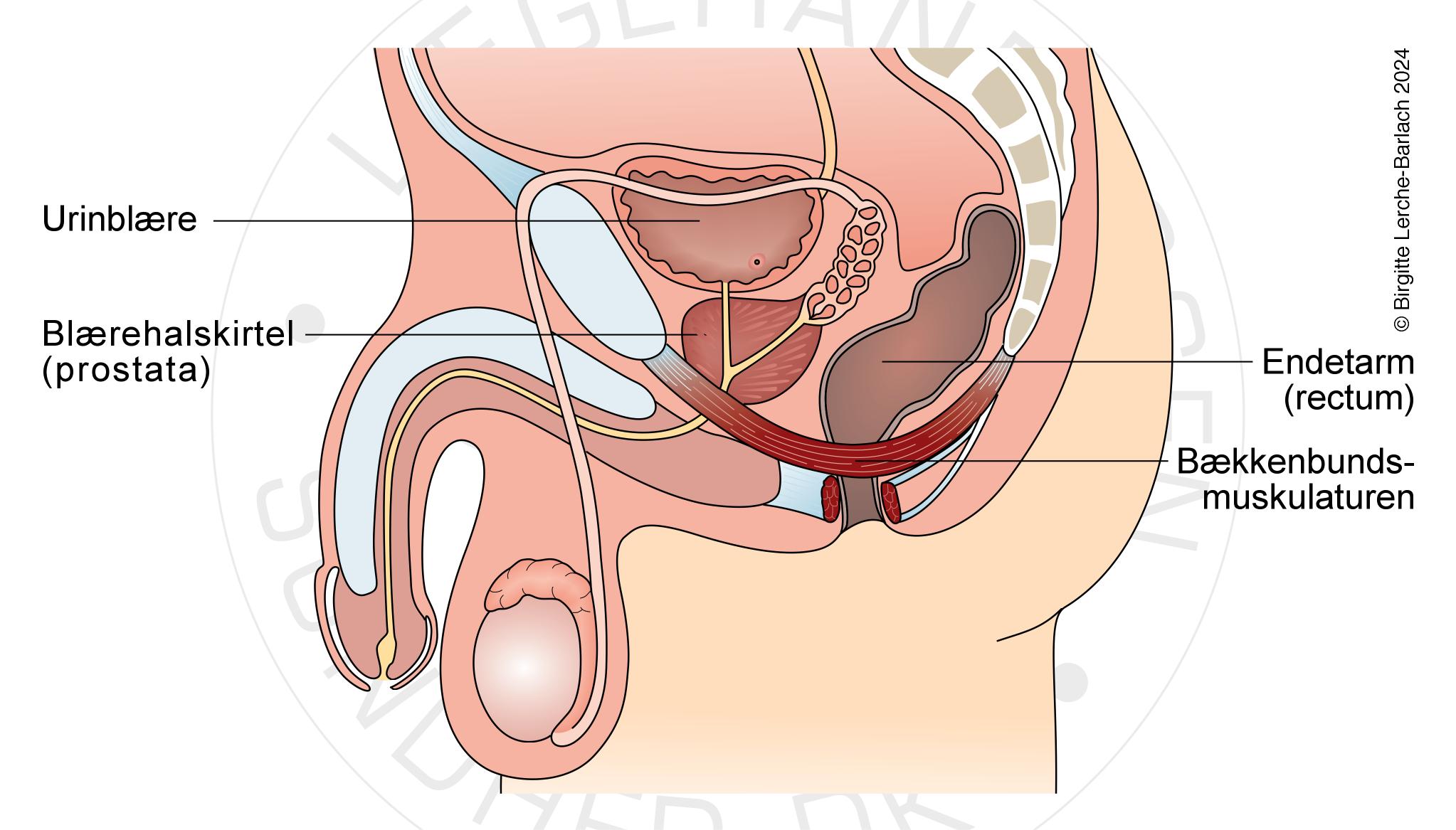 Tegning der viser placeringen af bækkenbundsmuskulaturen hos mænd