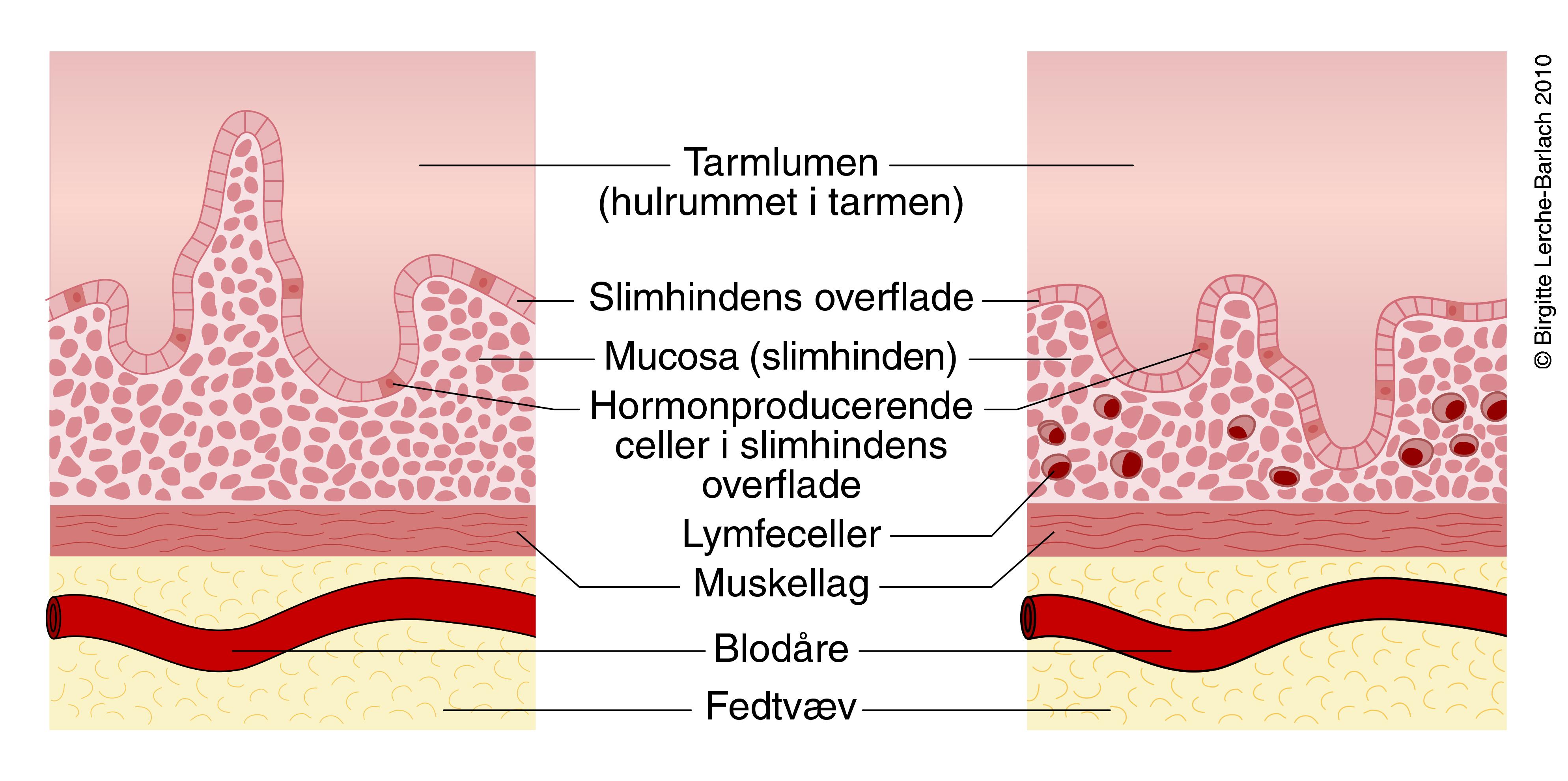 Cøliaki er en sygdom, som rammer den inderste del af tyndtarmen ind mod hulrummet i tarmen. Tilstanden skyldes, at kroppens immunforsvar starter en betændelsestilstand i tarmens slimhinde, som nedbryder og ødelægger laget af fimrehår i tyndtarmen - de såkaldte tarmvilli.