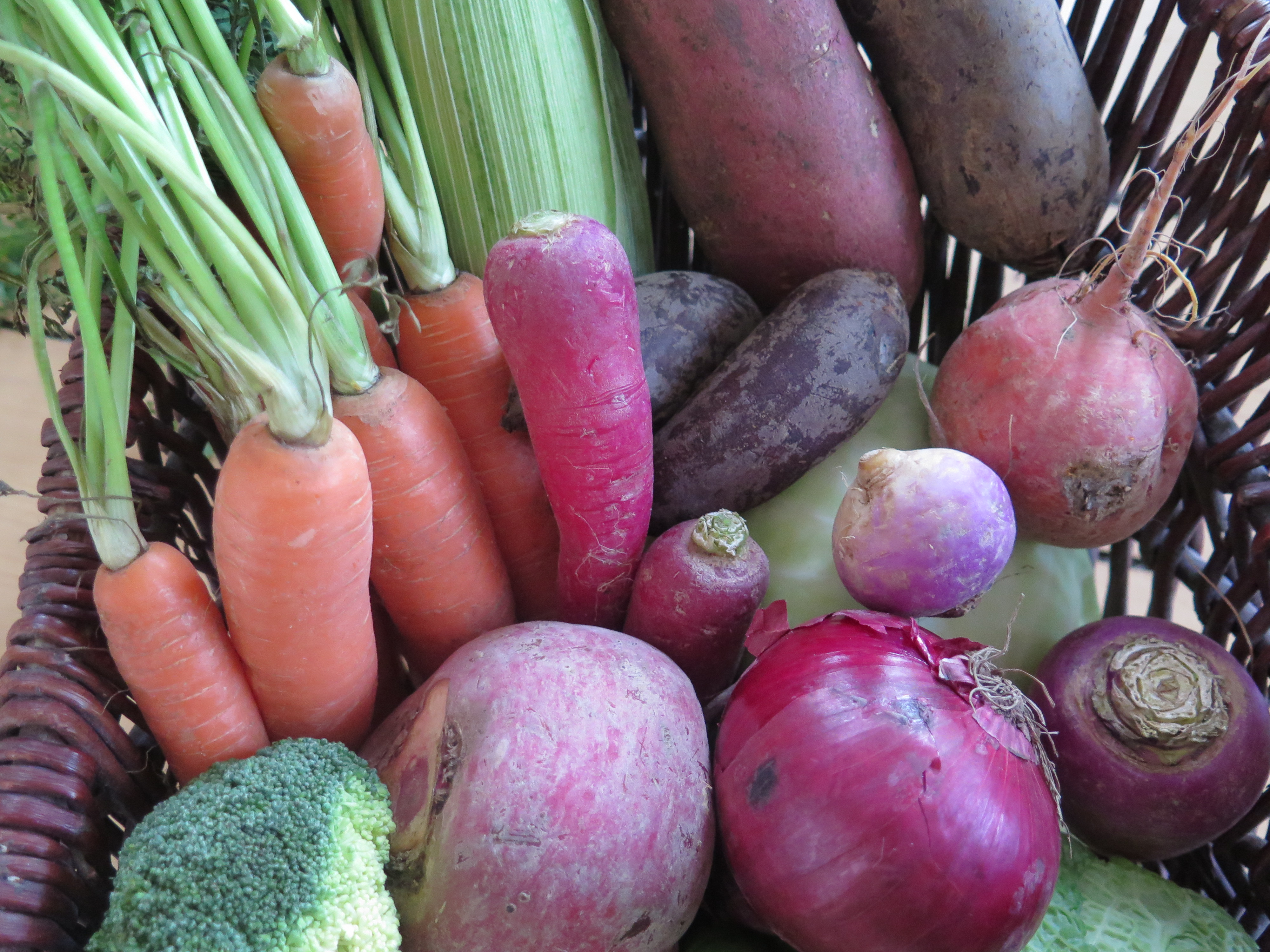 Grøntsager i kurv. Spis mange kostfibre og drik mindst 1½ liter vand hver dag.