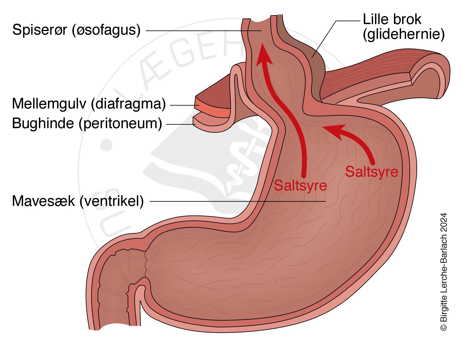 Mellemgulvsbrok. Dette er en tilstand med udposning af mavesækken gennem musklen i mellemgulvet. Denne muskel bidrager, sammen med lukkemusklen nederst i spiserøret, til at lukke ned til mavesækken, således at indhold derfra ikke kommer op i spiserøret. Mellemgulvsbrok findes hos 50-70 % af dem med refluks. Udposningen bidrager til at svække lukkemekanismen. Man kan dog godt have mellemgulvsbrok uden at have refluks