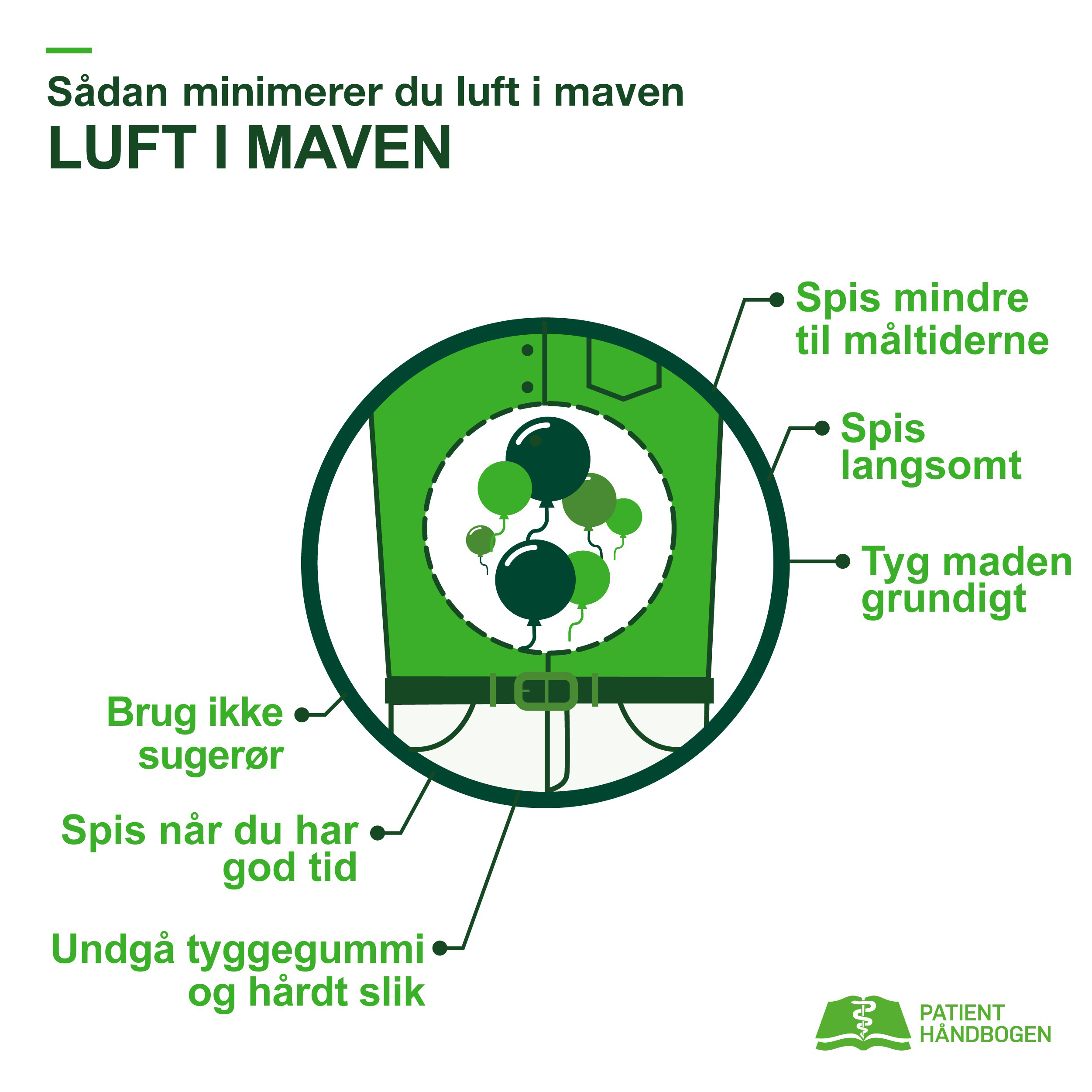 Ved at spise mindre og langsommere, undgå tyggegummi, hårdt slik og rygning kan du i nogen grad selv sænke mængden af luft i maven