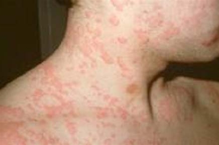 Reaktionen viser sig oftest i form af hudkløe, rødme, hævelser, besvær med at trække vejret, opkast, diarré og/eller smerter i maven