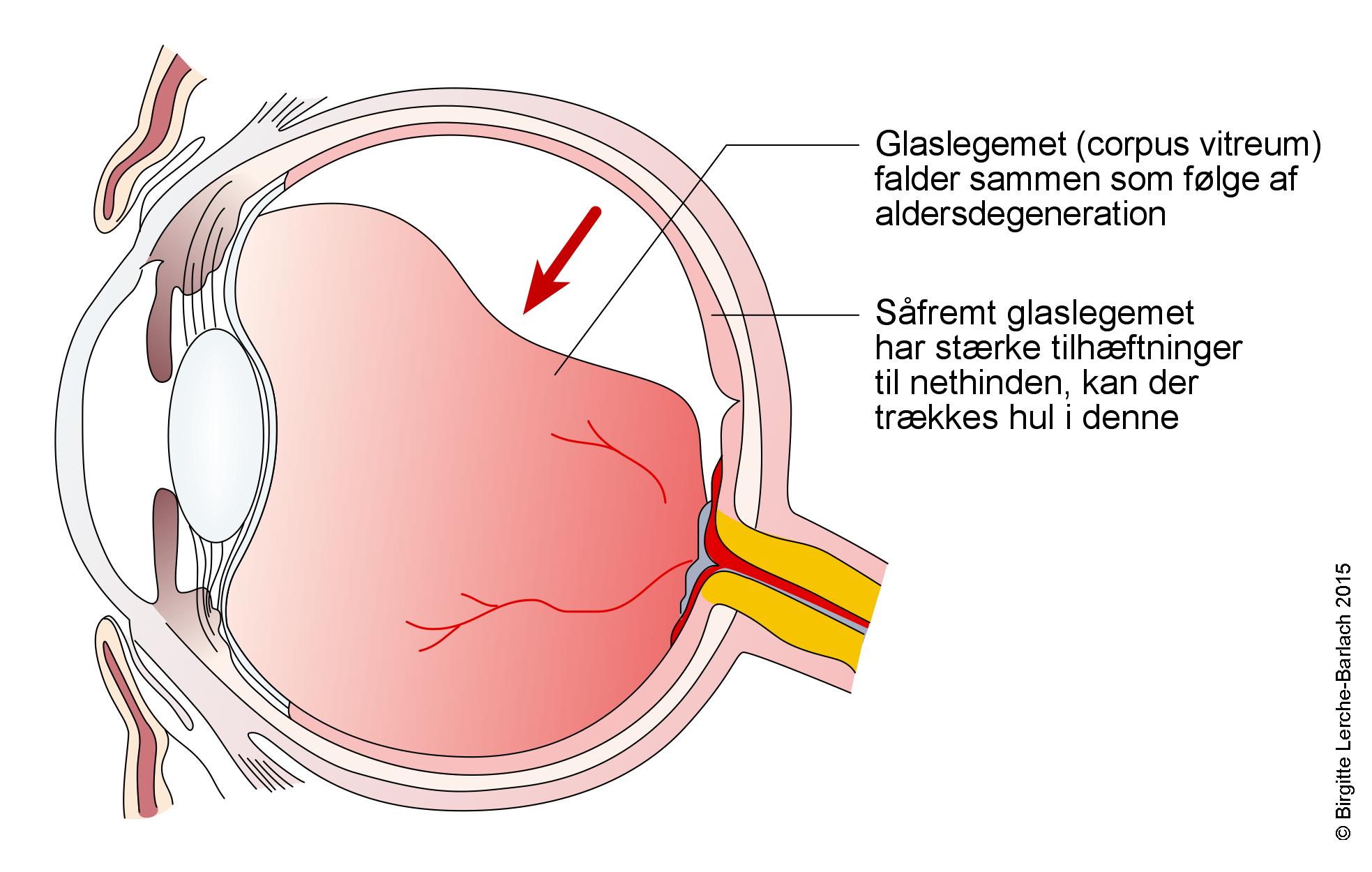 I de unge år er glaslegemet en fast gelé, der virker som støtte for nethinden. Med alderen bliver glaslegemet dog mere flydende. Denne ændring starter fra glaslegemets midte og breder sig mod periferien. Til sidst står der kun en kappe af gelé tilbage helt ude ved nethinden. På grund af tyngden vil de øverste områder af denne kappe på et tidspunkt falde ned, og hvis den hæfter til nethinden, kan denne få revet et hul. Hvis der siver væske fra det flydende glaslegeme ud gennem dette hul, vil nethinden gradvist kunne løsnes. I det område, hvor nethinden løsnes, vil sansecellerne miste deres forbindelse til hjernen, og kan derfor ikke sende synsindtrykket videre fra øjet.