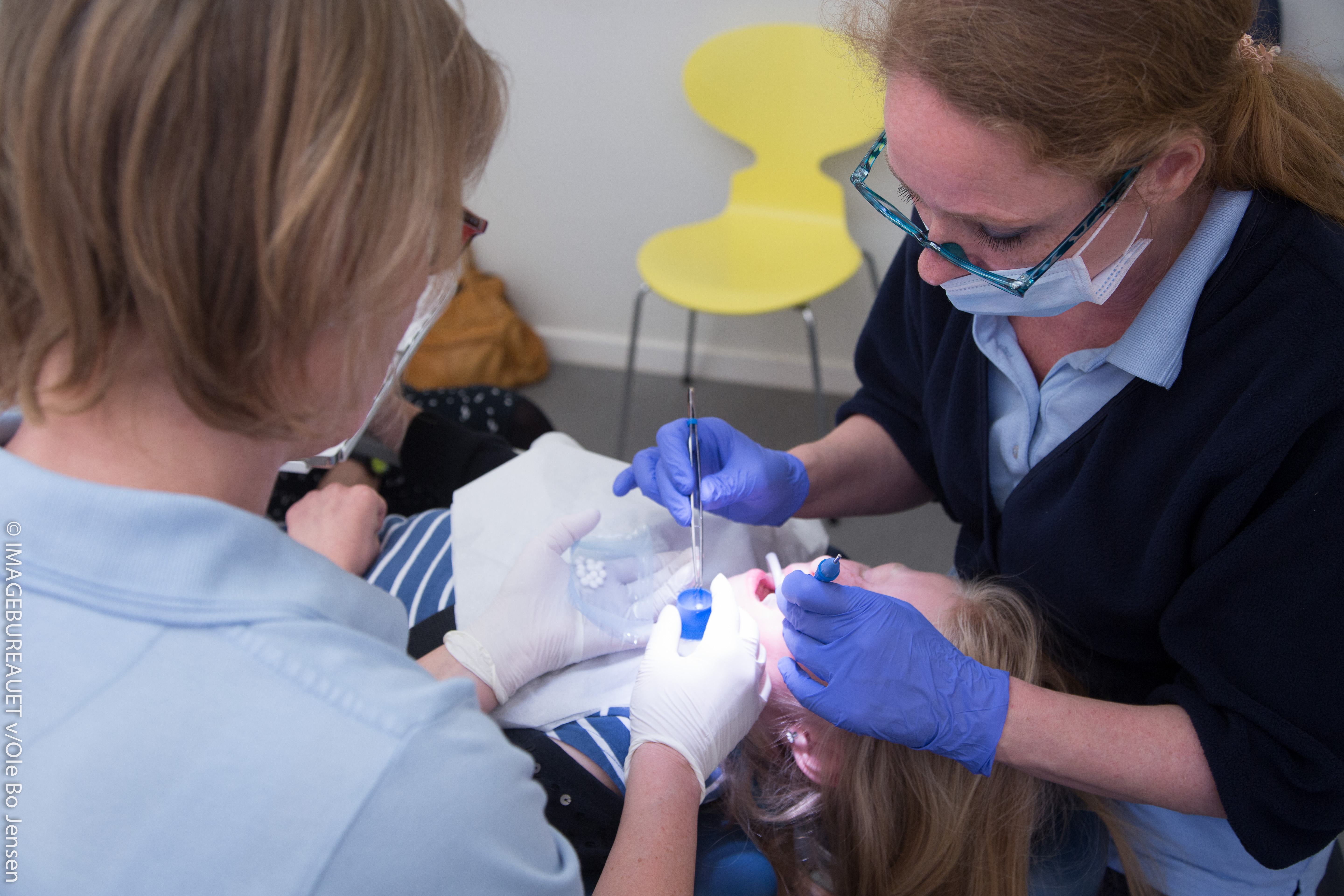 Inden der fyldes med plast, smører tandlægen hullet med forskellige væsker, der får plasten til at lime til din tand. Det er klinikassistenten, der rækker de forskellige ting til tandlægen, da det er meget vigtigt, at tanden samtidig holdes helt tør, så plasten klistrer bedst muligt til tanden.