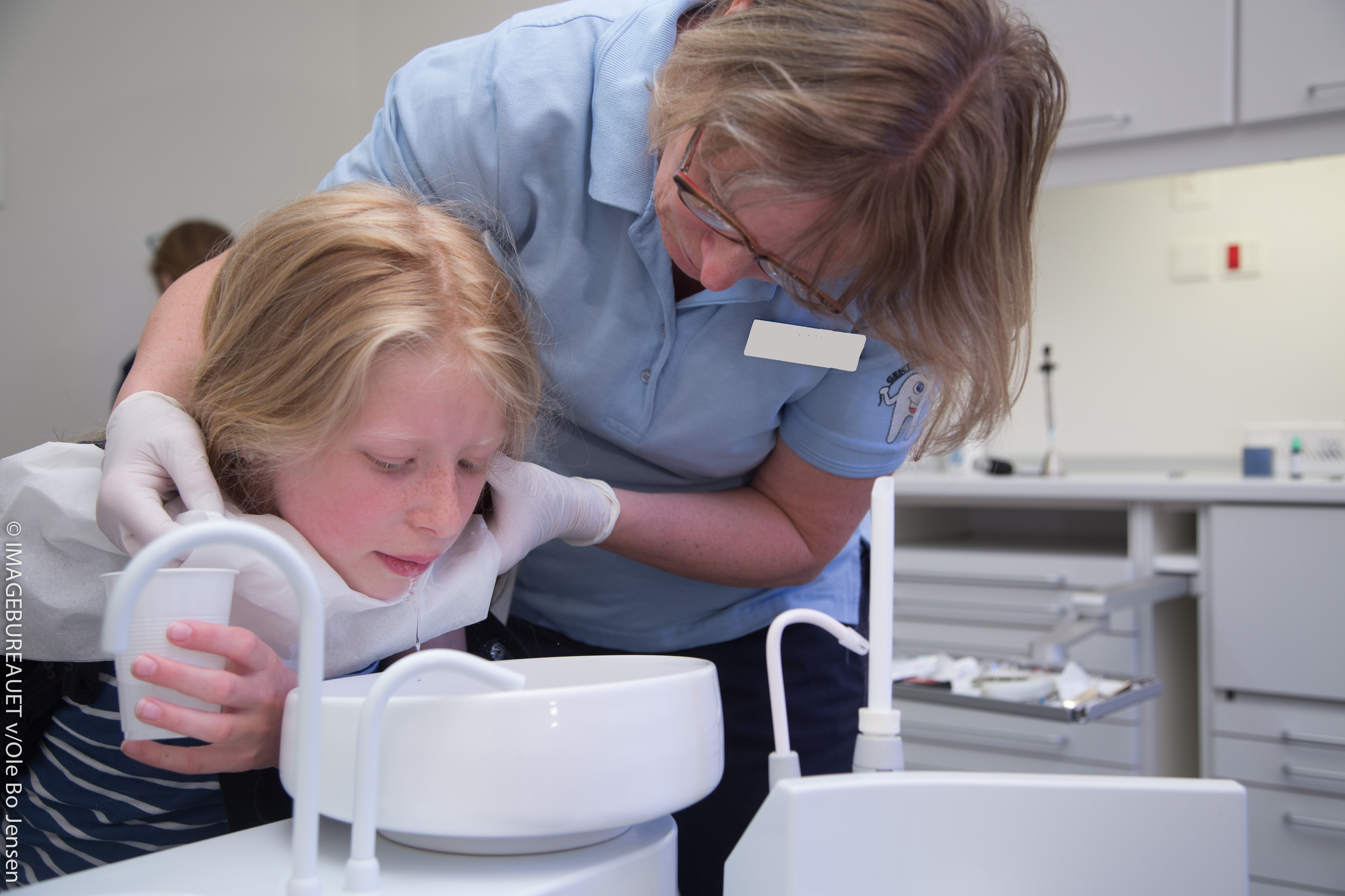 - Tandlægen har en lille kumme med vandhane. Her kan du få et glas vand til at skylle munden med og spytte ud, når du er færdig