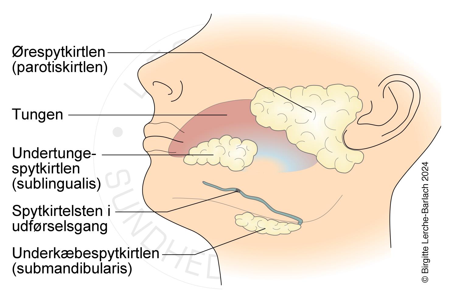 Du skal være særligt opmærksom, hvis du får symptomer på infektion i spytkirtlen. Det viser sig som feber og rød hud over kirtlen. Måske kan man også trykke pus ud af udførselsgangen.