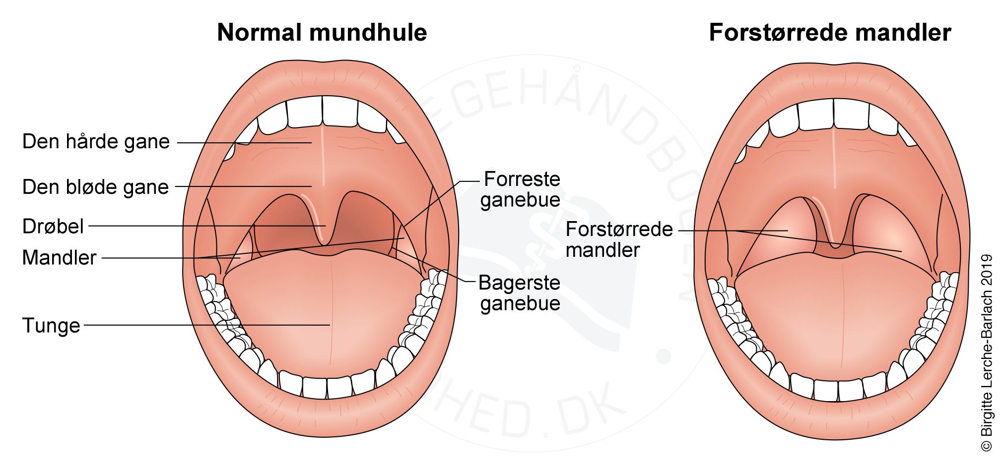 De store mandler er lette at se, når lægen kigger ned i svælget. Se figuren ovenfor.
