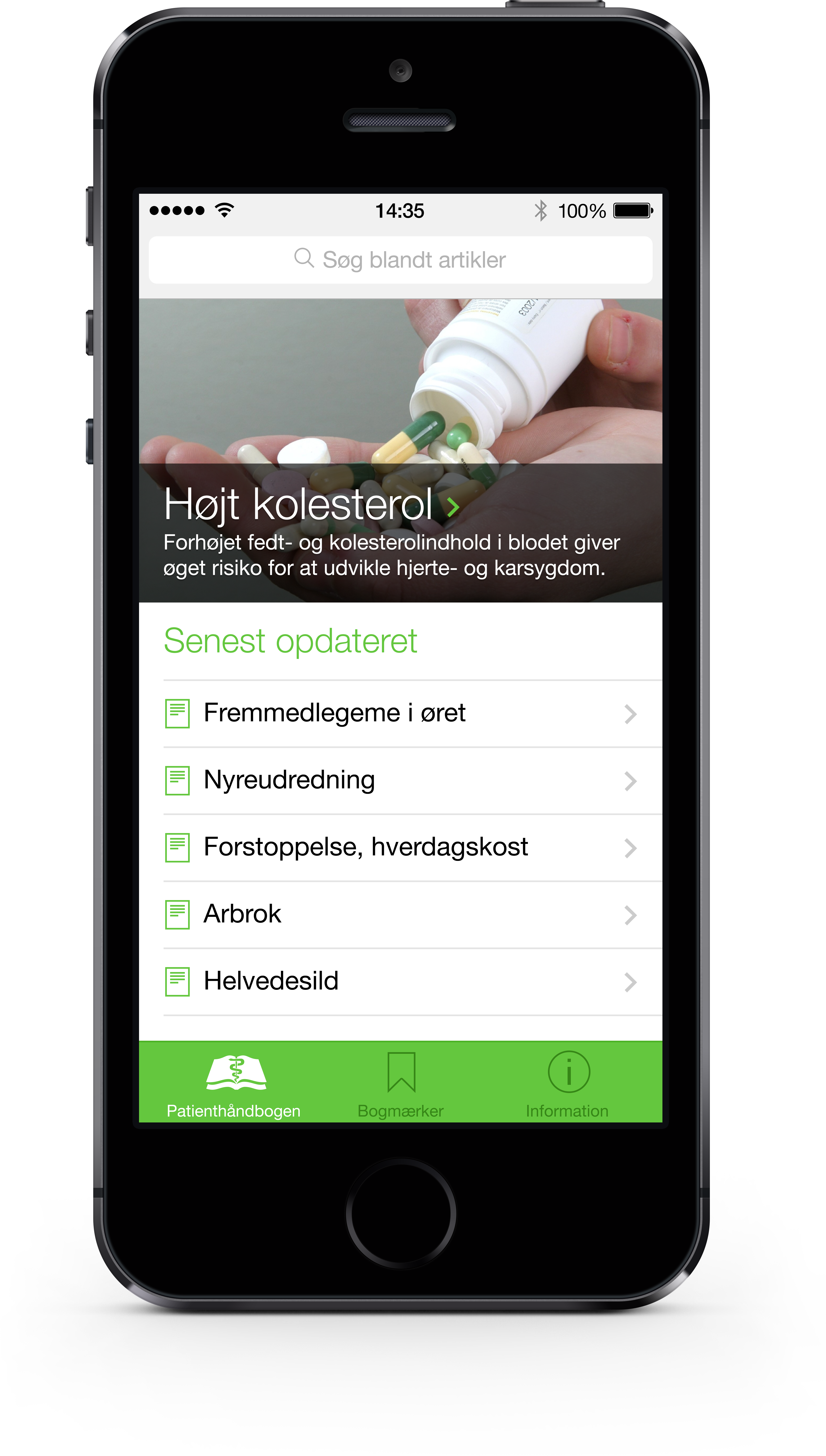 Med Patienthåndbogens app kan du søge i Patienthåndbogens over 3.000 sygdomsartikler og over 2.000 illustrationer i form af tegninger, røntgenbilleder, fotos, animationer og videoer. Du kan gemme dine favoritartikler og dele indhold i Patienthåndbogen med andre via e-mail, sociale medier og andre apps.