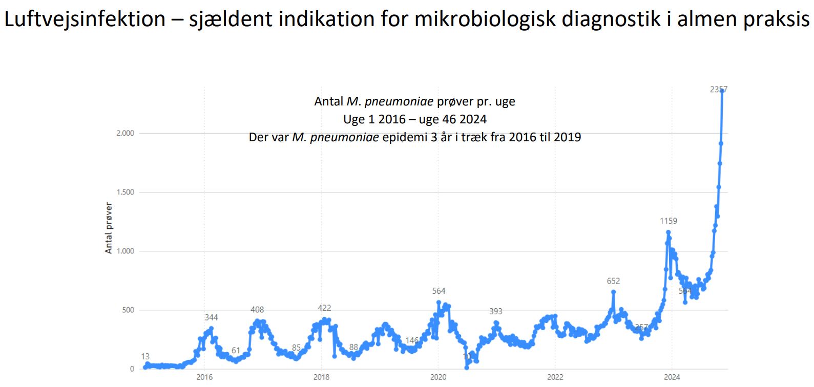 Den regionale klinisk mikrobiologiske afdeling (KMA) i Region Sjælland har oplevet en kraftig stigning i antal prøver fra almen praksis til PCR-test for luftvejsinfektioner, især undersøgelse for atypisk pneumoni.