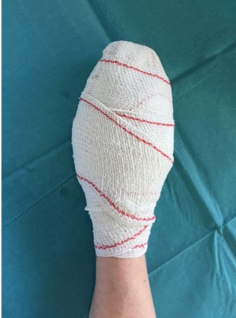 Mindre brandsår forbindes med Mepilex transfer eller 2 lag jelonet, store mængder sugende gaze og elastikbind over fingre, så de kan bevæges mest muligt