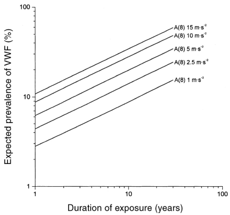 Figuren viser en international anerkendt (ISO) dosis-respons sammenhæng mellem varighed af hånd-arm vibrationseksponering i år og andel af udsatte, som forventes at udvikle hånd-arm vibrationssyndrom ved forskellige niveauer af vibrationsintensitet (målt i m/s2). Dosis-responskurven er baseret på undersøgelser af 576 italienske stenbrudsarbejdere1.