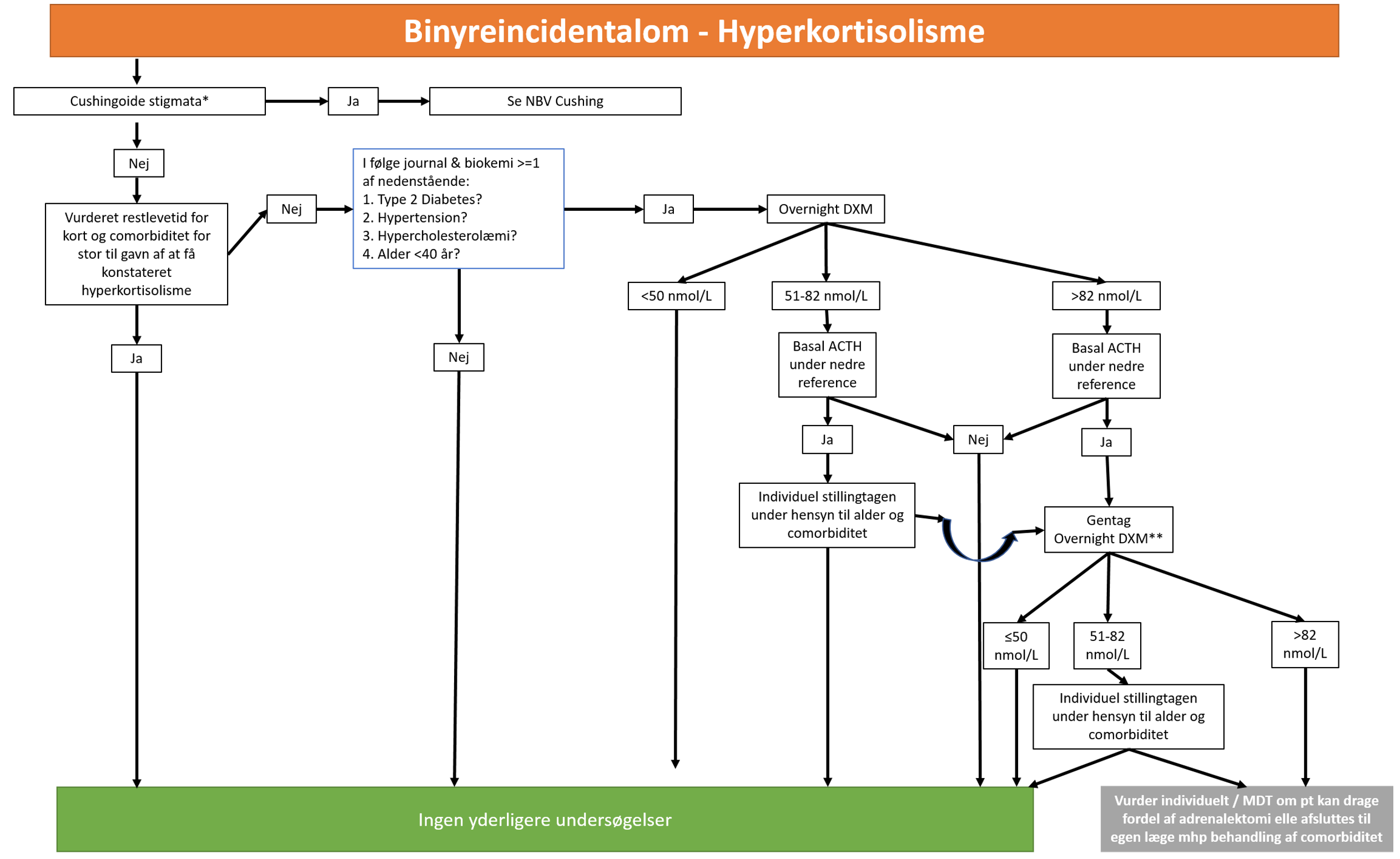 Udredning mhp. øget cortisolsekretion i form af overnight dexametason suppressionstest udføres på de fleste og altid inden eventuelt adrenalectomi. Beslutningsalgoritmen i relation til øget cortisolproduktion fremgår af nedenstående flowchart: