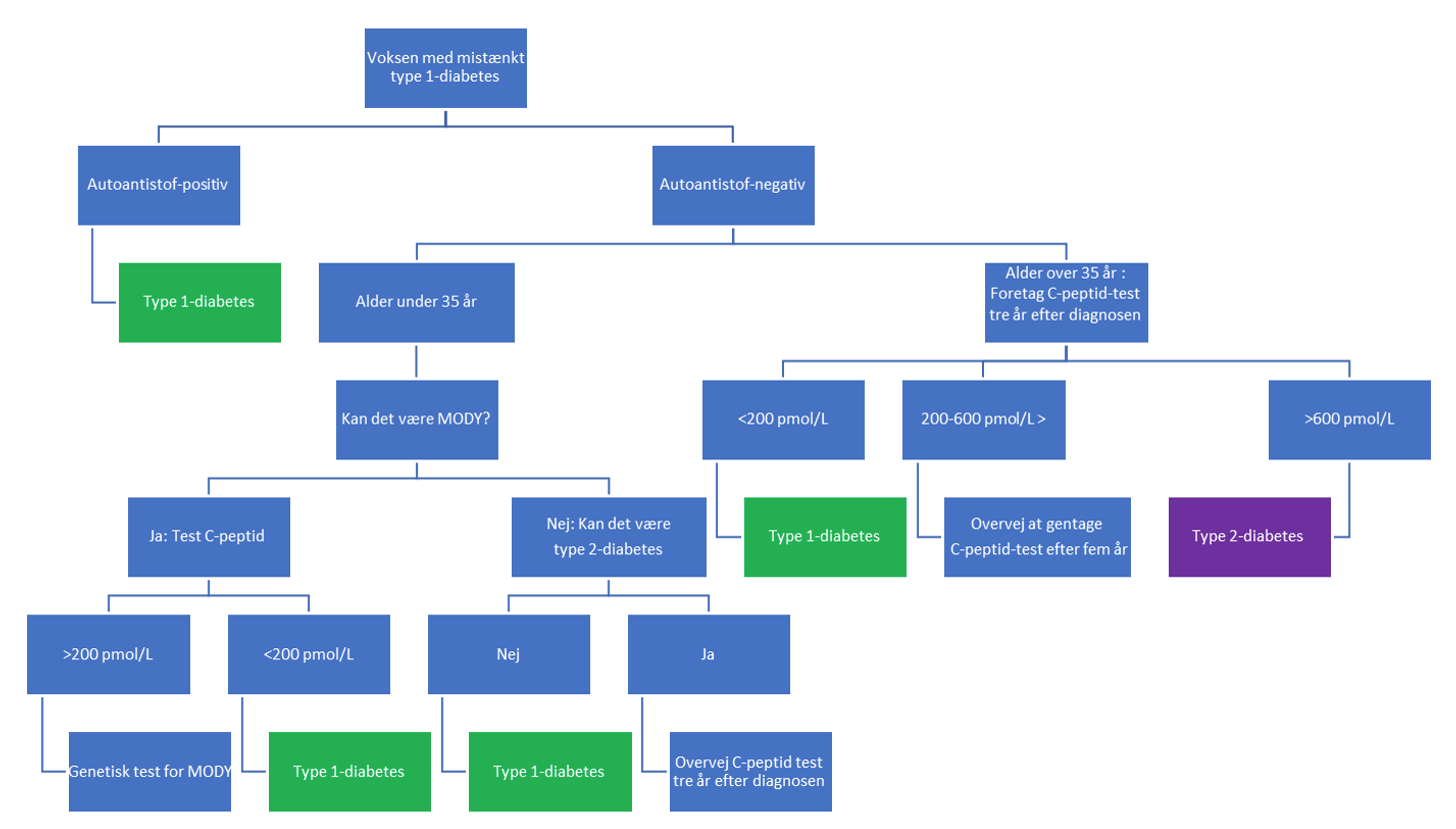 Mhp. at fastslå om det drejer sig om type 1 diabetes eller en af de 2 differentialdiagnoser: MODY (Maturity Onset of Diabetes of the Young) eller langsomt debuterende type 1 diabetes, tidligere benævnt LADA ( Latent Autoimmune Diabetes of Adults) kan nedenstående algoritme følges:
