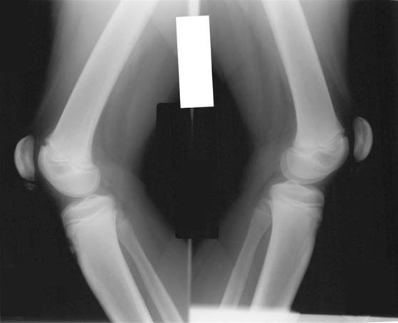 Patienter med Osgood-Schlatters sygdom kan have lignende røntgenfund, men de er lokaliserede til det distale fæste for patellasenen på forreste tuberositas tibia