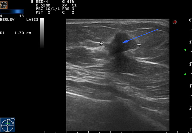B: Forandringen undersøges også med ultralydsskanning, der også giver mistanke om kræftknude (blå pil). Som led i triplediagnostikken tager man biopsi, som siden viser sig at indholde ondartede (maligne) celler. Der tages biopsi fra knuden. Patologisk undersøgelse af prøven viser, at det er kræft.